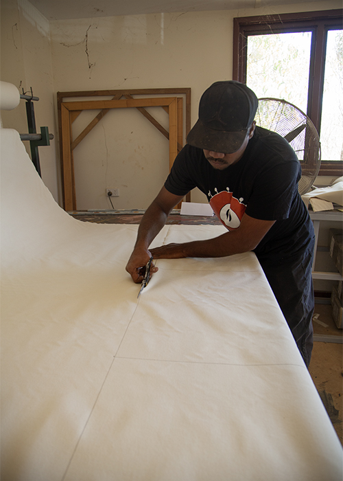 Every day in the workshop, artists are mixing paint, crushing ochre, stretching and priming canvases and constructing stretcher frames.